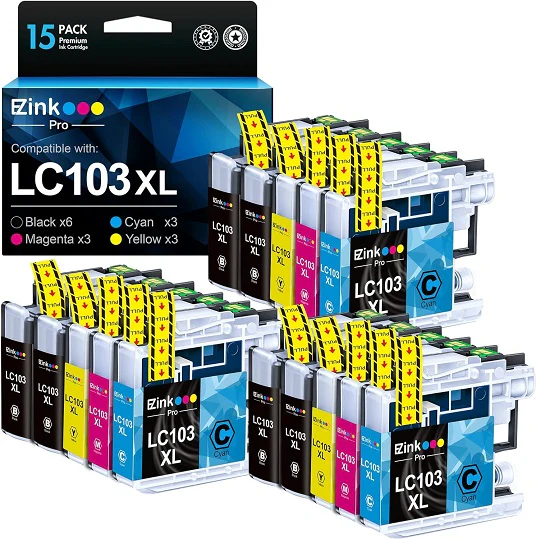 - Package Contents: 6 x LC103BK LC103 Ink Cartridges Black, 3 x LC103C LC103 Ink Cartridges Cyan,3 x LC103M LC103 Ink Cartridges Magenta, 3 x LC103Y LC103 Ink Cartridges Yellow (Total LC103XL 15 Packs)